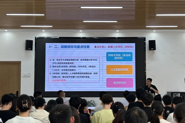 6月14日,发展规划处处长、机关党委发展规划处党支部书记朱广华受邀作《百年征程谱华章 赓续奋斗正当时——“名城名校”融合发展战略宣讲会》专题党课。他以生动的案例、详实的数据详细介绍了学校自办学以来的基本情况,深入剖析了公司与南通市“名城名校”融合发展战略目标与重点任务,以及当前的主要进展和取得成效。他希望通过“名城名校”融合发展战略以校地联合高质量发展实现同频共振,推动校地合作进入更高水平、更广领域、更深层次的新阶段,共同构建“名城育名校、名校润名城”的互动发展新格局。