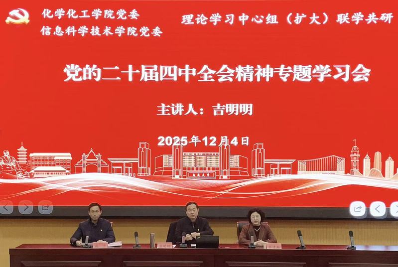 为引导师生深入学习贯彻党的二十届四中全会精神,12月4日下午,yl6809永利检测中心与化学化工学院联合召开党的二十届四中全会专题学习会。市委宣讲团成员、公司党委常委、副董事长吉明明应邀做专题辅导报告。yl6809永利检测中心、化学化工学院、智能信息技术研究中心全体教职工及员工代表参加会议。信息科学技术公司党委书记周平主持会议。